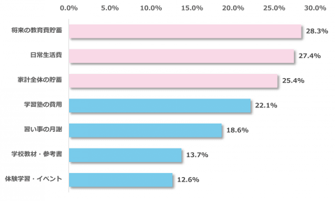 給食費無償化や教育費の負担軽減によって生じた余剰費用に関する設問では、「将来の教育費貯蓄」(28.3%)が最多だった。次いで「日常生活費」(27.4%)、「家計全体の貯蓄」(25.4%)と、短期的な消費よりも将来への備えを優先する傾向が見られる。