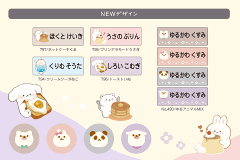 イラストMIXタイプには、1シートに4種類のイラストが入っている。どれも輪郭や表情をやわらかく描いた、ほっとするイラストタッチで、文字の読めない小さな子供でも「マイマークとして認識しやすい」デザインとした。