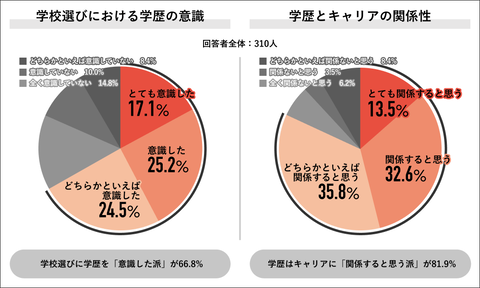 「学校を選ぶ際に学歴を意識したか」という設問では、「とても意識した」(17.1%)、「意識した」(25.2%)、「どちらかといえば意識した」(24.5%)となり、合計で「意識した派」が66.8%となっている。
