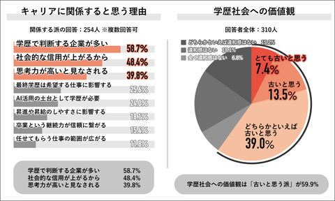 なお、学歴社会への価値観については「とても古いと思う」(7.4%)、「古いと思う」(13.5%)、「どちらかといえば古いと思う」(39.0%)の合計で「古いと思う派」は59.9%となった。この数字は2024年時の調査から変わらない。