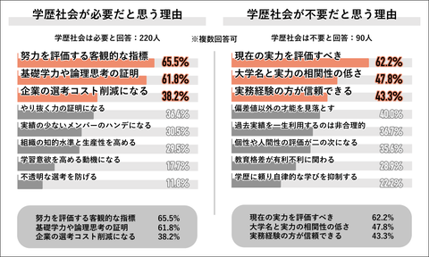学歴社会は必要と回答した220人にその理由を聞くと、「努力を評価する客観的な指標」が65.5%で最多となり、次いで「基礎学力や論理思考力の証明」が61.8%、「企業の選考コスト削減になる」が38.2%となっている。