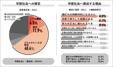 賛成派の201人にその理由を聞くと、「(業界/職種への)適応力の判断材料になる」が43.8%で最多となり、次いで「学歴で努力した経験がある」が41.3%、「努力した人が正当に報われるべき」が39.8%となった。