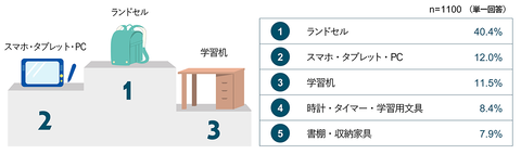 入学準備で「最も優先して購入したもの」を聞いたところ、1位は「ランドセル」(40.4%)、2位は「スマホ・タブレット・PC」(12.0%)という結果となり、3位に「学習机」(11.5%)がランクインしている。