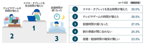 子供の生活で「困っていること」を聞いたところ、「スマホ・タブレットを見る時間が増えた」が29.0%で最多となり、「テレビやゲームの時間が増えた」(28.5%)、「就寝時間が遅くなった」(27.0%)と続いた。