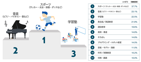 子供が習っている習い事の種類については、「スポーツ系(サッカー・水泳・体操・ダンスなど)」(37.7%)が最多に。次いで「音楽系(ピアノ・バイオリン・歌など)」(23.1%)、「学習塾」(22.5%)、「英会話/英語教室」(21.8%)が僅差で続く結果となっている。