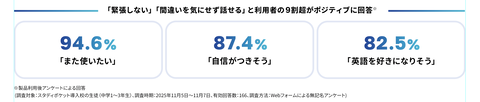 高知県教育委員会の協力のもと、県下の中学校を対象とした先行トライアルでは、利用者の94.6%が「また使いたい」、80.72%が「間違いを気にせず話せる」と回答。利用者の8割超が「英語が好きになりそう」「自信がつきそう」と回答しているという。