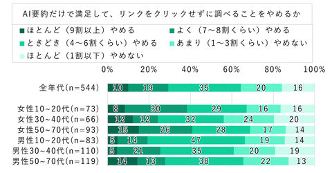 性別と年代別に見ると、10代から20代の女性と50代から70代の女性では、「ほとんどやめる」と「よくやめる」を合わせた割合が約4割となり、ほかの層よりもゼロクリック検索の実施率が高い傾向が示された。