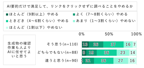 さらに、生成AIが作成した情報に対する意識とゼロクリック検索との関係も分析。「生成AIで作成したテキストを宿題や仕事で提出する際、生成物の確認作業も人よりAIに任せていい」と考える人ほど、ゼロクリック検索を行う割合が高い。
