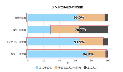 購入するランドセル・通学カバンの決定権については、「主に子供」「子供と大人の両方」と回答した人が96%を占め、子供の意見を尊重する家庭が多いことがわかる。特に、デザインやカラーについては9割以上の子供が決定権を持つ一方で、機能については大人の約70%が決定に関わっている。