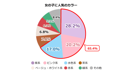 女の子の人気カラーは紫系(28.2%)、ピンク系(20.2%)、水色系(17.0%)がトップ3で、全体的に「くすみカラー」と呼ばれる淡い色が支持された。