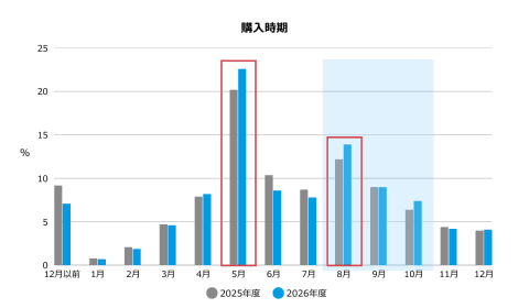 購入時期は、ゴールデンウィークがある5月と、お盆休みの帰省時期にあたる8月にピークが見られる。昨年比では、8月から10月の購入割合が増加。メーカー直営店などの展開で、後半時期でも豊富なラインアップからランドセルを選べるようになったことから、購入時期の分散が進む傾向となっている。