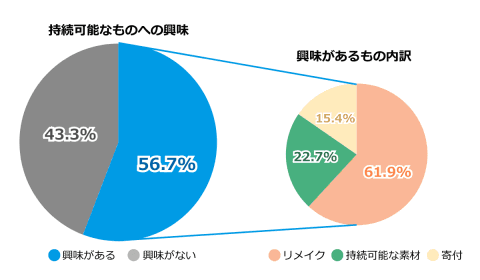 ランドセル製品の「持続可能性(サステナビリティ)」について聞いたところ、約57%の人が「興味がある」と回答した。使用済みのランドセルを財布などに作り変える「リメイク」への関心が高いほか、環境配慮型素材への注目も集まっている。
