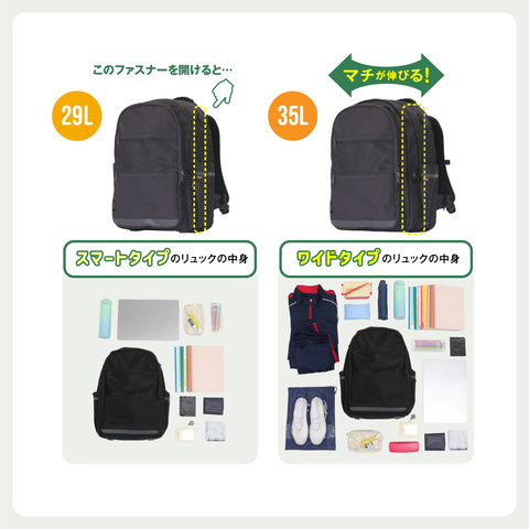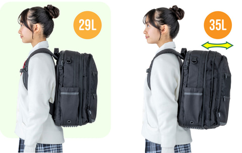 KakuchoUは、容量を29Lから35Lまで変更できる「サイズ調整ファスナー」を搭載。授業中心で荷物が少ない日と、部活動や宿泊行事などで荷物が多い日とで、1つのリュックを使い分けられる設計だ。学年が上がるにつれて増える教材や持ち物にも対応し、買い替えの負担軽減を意識した商品となっている。