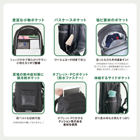 熱中症対策として、背面に保冷剤を収納できる専用ポケットを設置。内部にはタブレット端末やパソコン専用ポケットのほか、小物を整理しやすい複数の多機能ポケットを備え、現代の学習スタイルに対応した。
