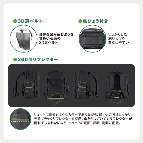 また、身体への負担を減らすため、立体構造の3D肩ベルトと背面パッドを採用。重い荷物を背負った際も負荷が適切に分散され、安定した背負い心地を実現しているという。生地には耐久性の高いコーデュラ生地を使用し、はっ水加工や底びょう、360度リフレクター、内蔵レインカバーなど、安全性と耐久性にも配慮している。