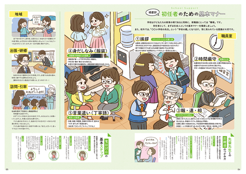 紙面では、初任者のための基本マナーとして、あいさつや身だしなみ、時間厳守、報告・連絡・相談などをイラストとともに解説しているほか、先輩教員との距離感のつかみ方や電話対応の基本ステップについて相談内容や話し方、マナーについて具体的に紹介している。