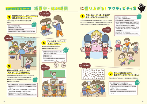 また、クラスマネジメントの一例として、授業中や休み時間に盛り上がるアクティビティを紹介。クラスを2チームに分けてじゃんけんで勝負する「チョキの女王」や、プリントに書いた数字を限られた時間で丸を付けていく「ナンバー探し」、グループやチームの緊張をほぐす「島じゃんけん」といったアイデアも掲載した。
