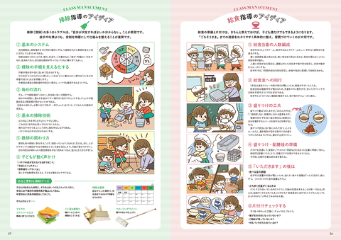 さらに、給食や掃除で「子供たちに指導すること」を道筋を追って紹介。具体的なステップを追うことで、子供たちに習慣付けを行う方法や「子供自身が何をすべきか」を気付かせる方法を明確にしている。