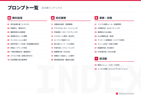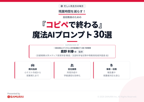 株式会社SAMURAIは、「校務DX魔法のプロンプト30選」を無償公開したと2026年2月18日に発表した。対象は高校の教員で、アンケートの回答者全員にダウンロードURLを提供する。