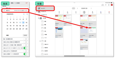 今回のアップデートでは、新たにカレンダー機能を搭載し、授業ノートをカレンダーからすぐに開けるようにした。1日や1週間単位での振り返りをしやすくすることで、学習習慣の定着を支援する。教員が授業ノートに授業日時を設定すると、児童生徒(配布先)のカレンダーに表示される。