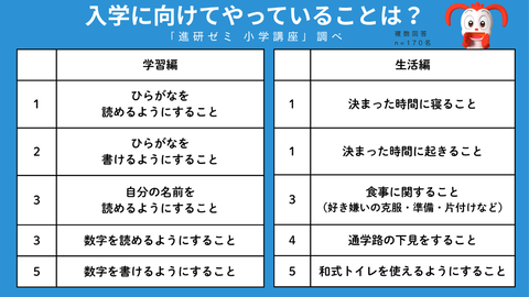 ・入学前準備は「ひらがなの読み・書き」「決まった時間に寝る/起きる」が1位