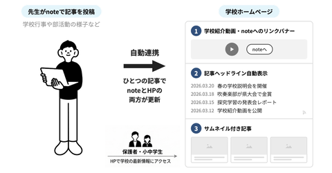 今回の協定では、こうした県の方針と現場の課題を踏まえ、note proの導入と学校ホームページとの連携によって、情報発信の体制を県全体で整える。保護者は学校ホームページを開くだけでnoteに投稿された最新の活動を知ることができ、進学先を考えている小中学生も各校の日常をイメージしやすくなる。