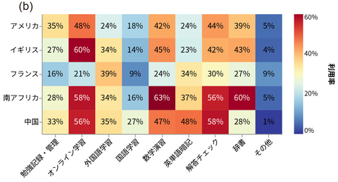 利用経験者に用途を尋ねると、フランス以外の4カ国で「オンライン学習」「数学の演習」「解答チェック」が上位を占めた。とくにアメリカ、イギリス、中国ではアプリ利用者のほぼ過半数が「オンライン学習」を選択しており、アプリが時間や場所に縛られにくい学習手段として使われていることがうかがえるという。
