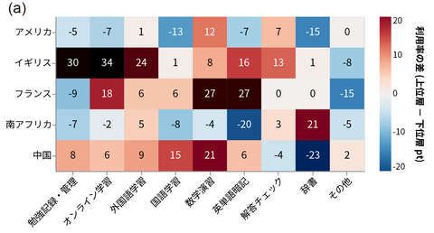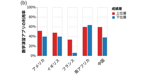調査では基礎的な計算問題32問のテストも実施し、成績上位25%と下位25%の利用傾向を比較した。その結果、南アフリカを除く4か国で、上位層の方が数学の演習用アプリをよく使っていた。フランスでは下位層の未使用率の高さが目立つ。