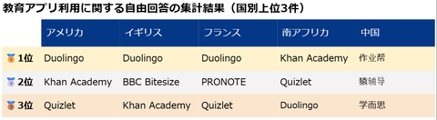 自由回答で実際に使っているアプリ名を尋ねた結果では、中国を除く4カ国でDuolingoが上位に入っている。Khan Academyはアメリカ、イギリス、南アフリカで多く挙がり、Quizletはアメリカ、フランス、南アフリカで目立った。イギリスではBBC Bitesize、フランスではPRONOTE、中国では作业帮、猿輔導、学而思が上位だった。