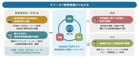 「すぐーる」は、同社の情報共有ソリューション「Locas」を構成するサービスの1つで、学校・家庭・地域をつなぐ教育現場向け連絡システムである。