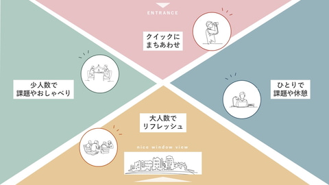 完成したラウンジは、待ち合わせエリア、少人数での学習と交流のエリア、個人学習と休憩のエリア、大人数での休憩エリアの4つで構成した。