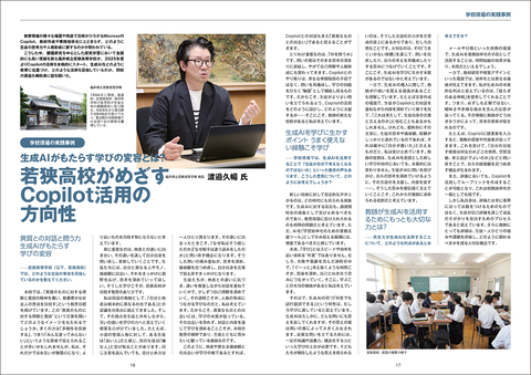 巻頭特集では、教育現場で使われる生成AIや教育における活用の方向性を整理し、AI時代に子供たちに求められる力を解説している。Copilotを情報の供給装置ではなく、思考の伴走者として活用する福井県立若狭高等学校の事例や、東京学芸大学附属小金井小学校、大阪市立住吉小学校、高知県須崎市、聖光学院中学校高等学校などの取り組みや事例も掲載した。