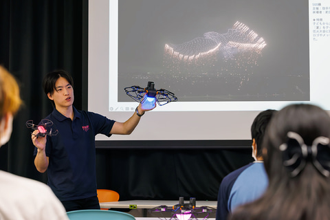 第2部ではドローンプログラミング体験として、プログラミングによるドローン制御、位置・動きの設計、ショー演出における応用について学びながら教育用プログラミングドローン「Hula-JP」を飛行させる。