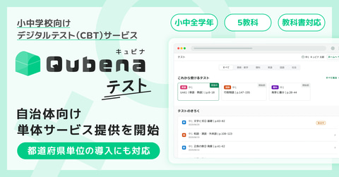 同社では、「個別最適で主体的な学び」と「教員の業務負荷の軽減」をテストの領域においても実現するため、2025年度に小中学校向けデジタルテスト(CBT)サービスとしてキュビナ テストをリリース。学習eポータル+AI型教材「Qubena(キュビナ)」の導入自治体向けに提供してきた。