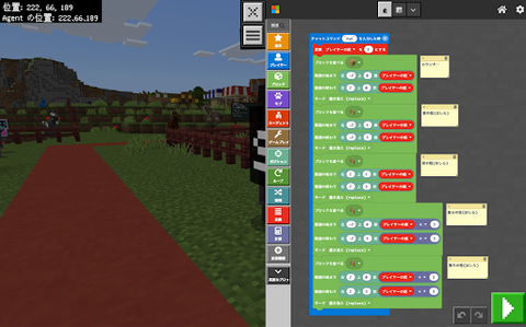 プラグラミングでの建築では、手作業でブロックを積み上げ、屋台らしく見えることを考え、プログラミングで自動化。参加者は、独自のコードを書いて思い通りに動かすプログラミングの面白さを体感した。