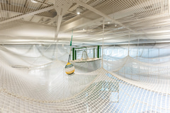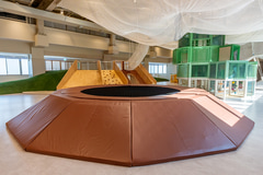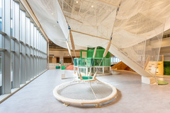 立体的に張り巡らされたネット遊具は、身体を使って登る・くぐる・跳ねるといった動きを通じて、身体的知能を刺激する。また、高低差や構造を把握しながら移動することで、空間的知能にも働きかける。さらに、「みんなのネット」は車椅子の子供も利用できる設計としており、天空ネットの揺れや振動を通じて他者の存在を感じ合い、ともに遊ぶ体験を生み出すという。