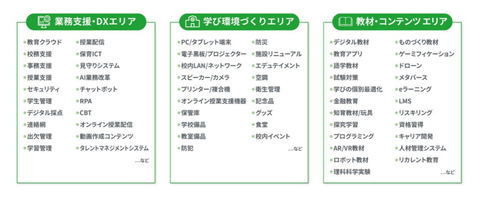 会場は3つの専門エリアで構成。「業務支援・DXエリア」では、AIによる自動採点システムや校務支援など、教員の働き方改革を後押しするツールを紹介する。「学び環境づくりエリア」では、GIGA第2期に向けた最新端末やインクルーシブ教育を支える設備を展示する。「教材・コンテンツエリア」では、探究学習キットやプログラミング、メタバース教材などを扱う。