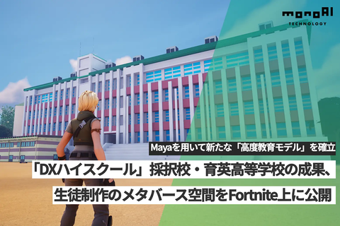 公開した空間は、生徒が1年間の授業で制作した3Dモデルをもとに、同社のメタバース開発支援サービス「monoNITE」の技術を利用してオンラインゲームの「Fortnite」に実装している。Mayaを駆使することで、実物の校舎に極めて近い、高精細なメタバース空間を実現しているという。