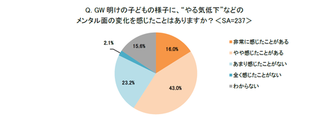 調査は、GW明けの子供のメンタル低下に関する保護者の受け止め方と対応をまとめたものだ。イー・ラーニング研究所によると、GW明けの子供の様子に「やる気の低下」などの変化を感じたことがあると答えた人は約6割だった。