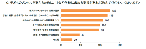 社会や学校に求める支援では、「親向けのメンタルケア情報の提供」が126人で最多となった。次いで「学校に相談できる専門スタッフの常設」が119人、「休みやすい・相談しやすい学校環境づくり」が108人、「子供向けの相談窓口の充実」が100人となっており、保護者自身がケアの方法について学びたいというニーズが高まっていることが明らかになった。