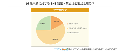 16歳未満へのSNS制限や禁止に関する設問では、「必要だと思う」が17.3%で、「少しならあった方がいい」が58.1%、「必要ないと思う」が24.6%だった。「必要だと思う」「少しならあった方がいい」の合計は75.4%で、約8割の小中学生が、16歳未満に対して何かしらのSNS制限が必要だと思っていることがわかった。