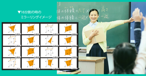 専用アプリを利用すれば、30人分の画面を同時にミラーリングことも可能に。クラス全員の考えや発表を一気にミライタッチに投影することで、新しい学びや発見のある授業が可能となる。