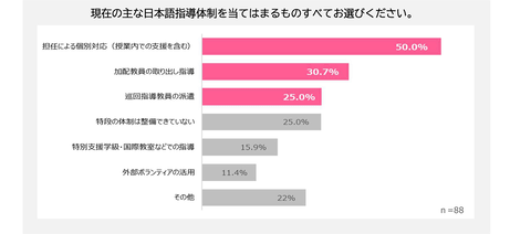一方で、日本語の指導体制については、「担任による個別対応(授業内での支援を含む)」が50.0%で最多となっており、依然として教員のマンパワーに頼った運用が続いていることがわかった。
