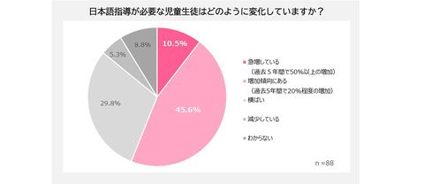文部科学省の2023年度の統計では、日本語教育を必要としている公立小中学校・高校などの児童生徒は6万9123人で、9年で1.9倍に増えた。今回の調査でも、教育委員会と管理職の56.1%が、日本語指導が必要な児童生徒が増加または急増していると回答している。