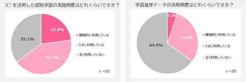ICT環境の整備と活用状況の差も示された。GIGAスクール構想で1人1台端末の環境が整う一方、日本語指導では「個別学習でICTを全く利用していない」が35.1%、「学習ログを全く活用していない」が64.9%と、端末やデータを使った個別の支援が十分に進んでいない状況となっている。