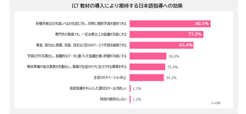 ICT教材の導入で期待する効果としては、「多種多様な日本語レベルの生徒に対し、同時に個別学習を提供できる」(80.5%)が最も多く、次いで「専門外の教員でも、一定水準以上の指導を可能にする」(73.2%)、「教室、取り出し授業、別室、自宅など自分のペースで学習を継続できる」(63.4%)と続く。