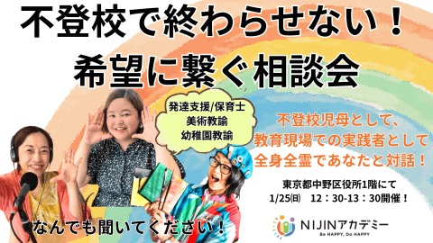 株式会社NIJINが運営する小中一貫オルタナティブスクールNIJINアカデミーは、東京都中野区役所1階の「ナカノバ」にて、不登校の子供を持つ保護者などを対象とした交流・相談ブースを2026年1月25日(日)に出展する。