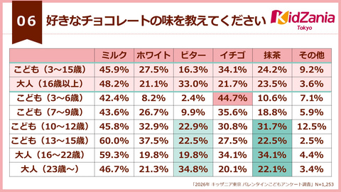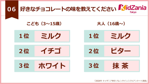 好きなチョコレートの味を聞いたところ、子供の1位はミルクで、2位がイチゴ、3位はホワイトだった。大人は1位がミルク、2位はビター、3位が抹茶となっている。3~6歳では、イチゴが44.7%で最も支持を集めた一方で、抹茶は10~12歳が31.1%と、大人全体の23.5%を上回っている。