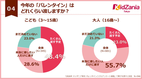渡す個数については、子供の約半数が「たくさん渡す予定(5個以上)」と回答した。一方で、大人の半数以上は「本当に渡したい人だけに渡す」と回答。いずれも約2割が「まだ決めていない」と回答している。