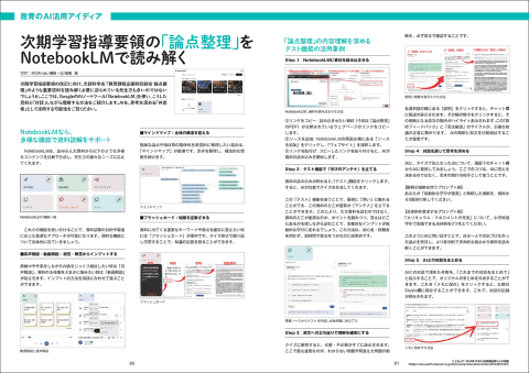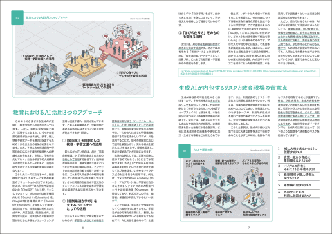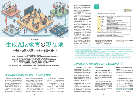 巻頭特集では、生成AIと教育の現在地を整理し、AI時代に子供たちに求められる力を解説しています。生成AIを単に答えを返す道具としてではなく、考えるための支援役としてどう位置付けるかという視点が示されている点も、同書の見どころ。教育現場でAIを導入する際、便利さだけでなく、学びにどう結び付けるかを考えたい読者にとって、参考にしやすい内容です。